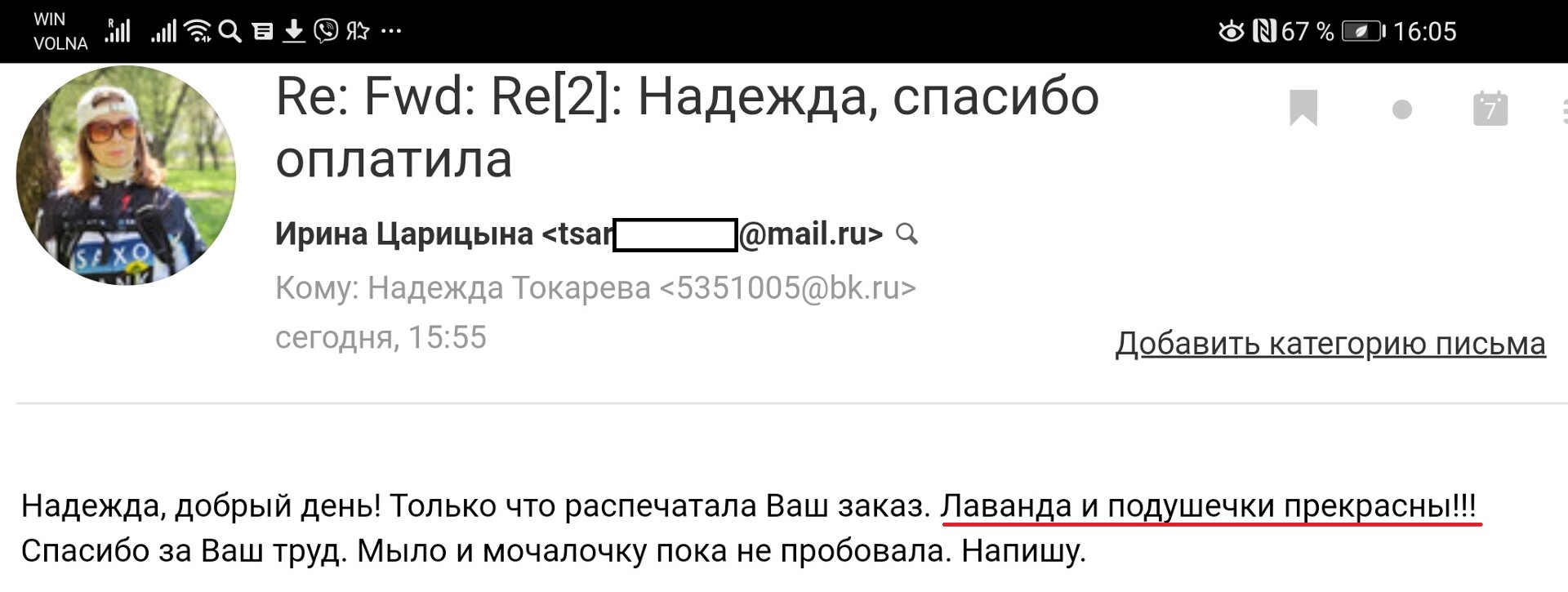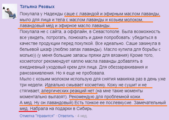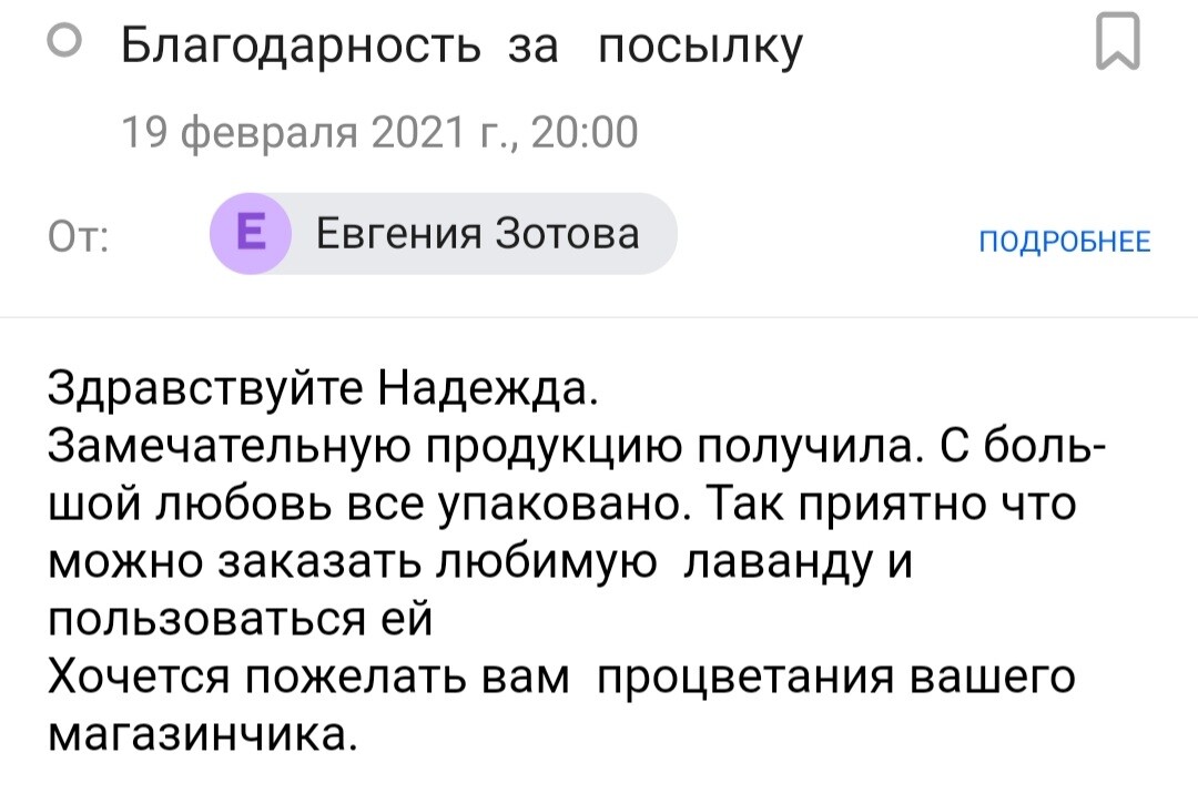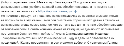 Настоящий аромат лаванды успокаивает и расслабляет. Я фанат этого сайта. Заказывала и пользоваласЬ почти всеми продуктами. Благодарна Надежде, все товары просто бомба!