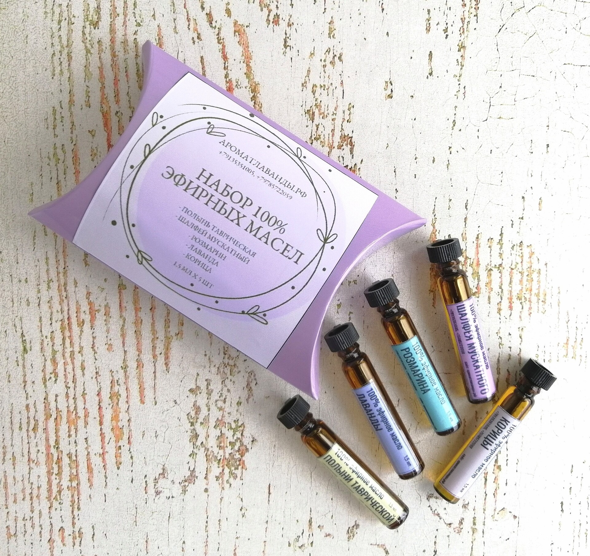 Мини-набор из пяти эфирных масел во флаконах из тёмного стекла объёмом 1,5 мл каждый. Все эфирные масла произведены методом паровой дистилляции. Не имеют в составе каких-либо примесей и консервантов.